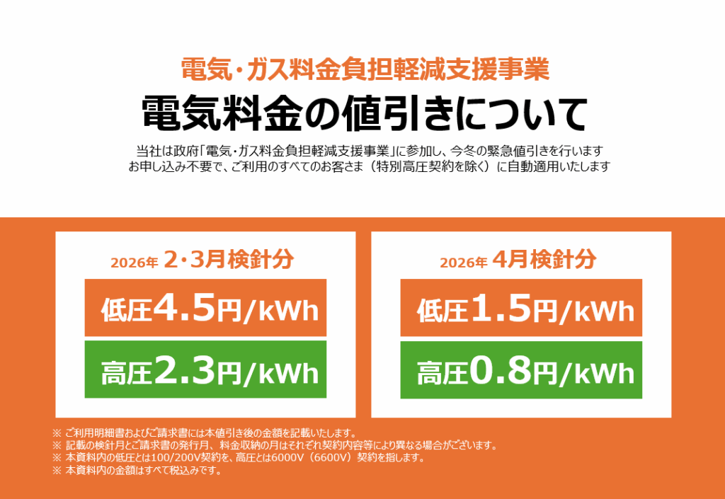 これにより2026年2月検針分より同4月検針分まで、当社のお客さまは電気料金の「燃料費調整額単価」に値引きが行われます。この値引きをお受けいただくことにおいて、お客さまに行って頂く手続きや、当社へのご連絡等の必要は一切ございません。